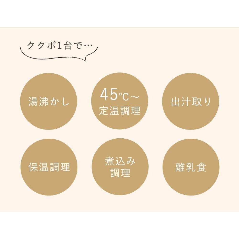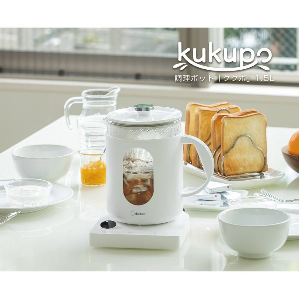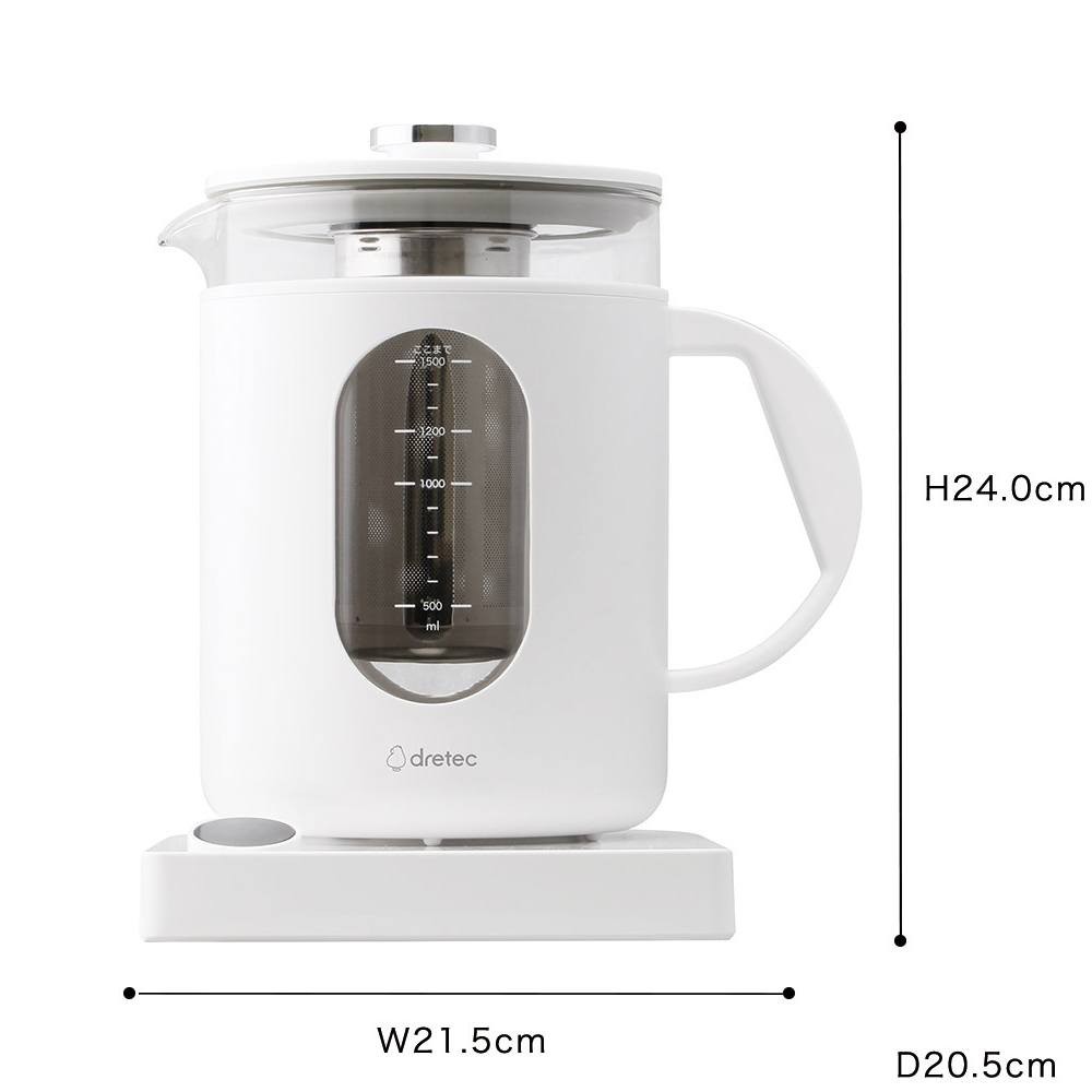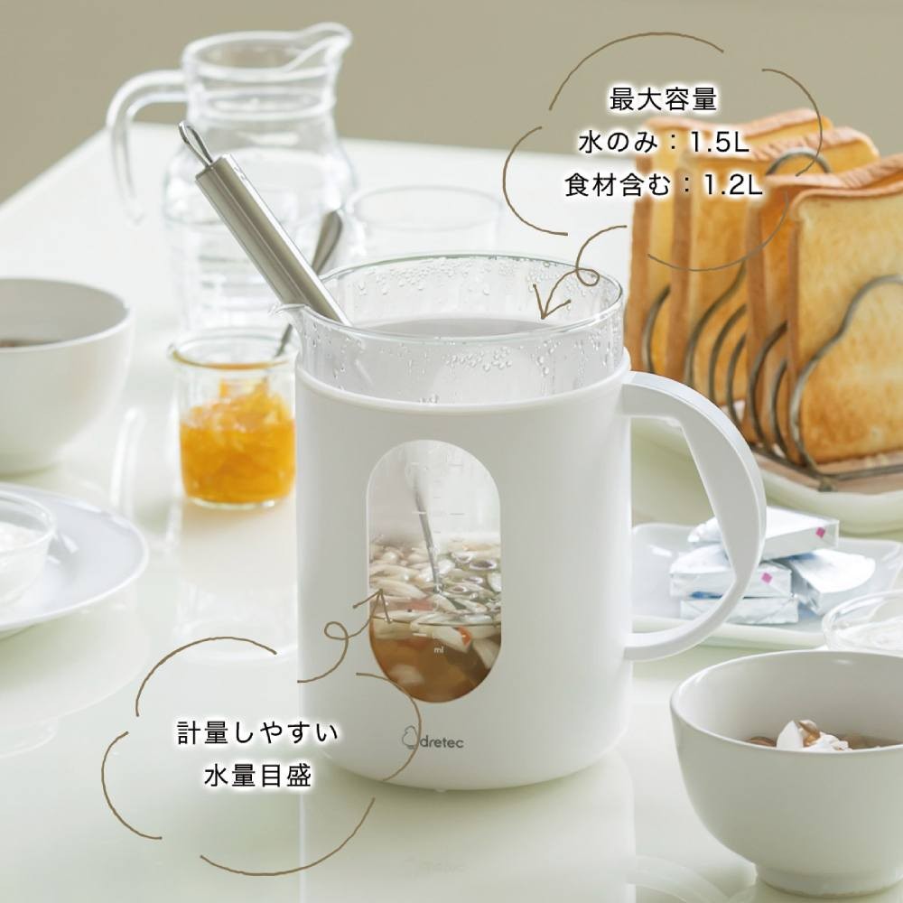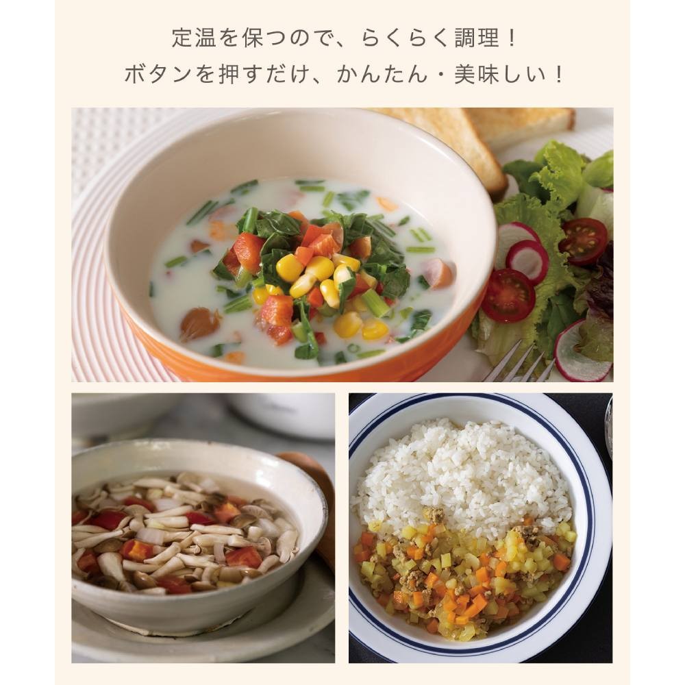 ・45℃~5℃刻みの温度設定と1分単位のタイマーでうまみを引き出す調理ポット ・1台で何役も活躍(茹でる・煮る・蒸す・温める・沸かす・消毒・保温など) ・大人数のお茶出しにも対応できる1.5Lの大容量 ・中身を見ながら水分量を目盛ではかれる。広口だから材料投入もラクラク ・料理研究家「浜内千波」監修。食材のうまみを生かした減塩レシピ本付 ・おたまを入れたまま蓋ができ、開閉も軽くてかんたん ・衛生的なガラスとステンレス素材を使用 ・耐熱ビニール袋を使用して低温調理や同時調理も可能