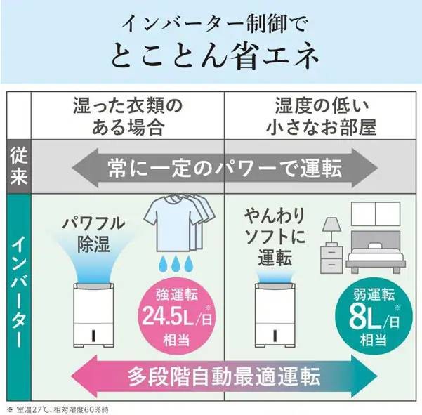 従来制御は、常に100%の能力で運転。それに対し、インバーター制御は、湿度に応じてパワーを自動でコントロールし、ムダのない省エネ除湿を可能にします。