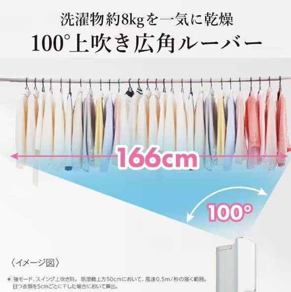 広範囲に風を送り、約8kgの洗濯物も、端から端まですばやく効率よく乾燥します。