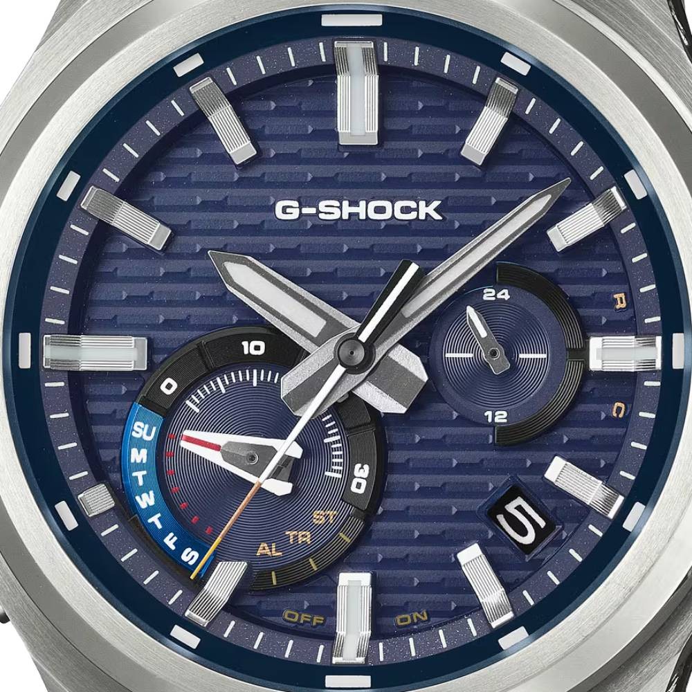 ロゴを排したベゼルは光の角度で表情を変え豊かな質感を演出。ステンレススチール製のバンドにはヘアライン仕上げとミラー仕上げを施し、三つ折れ式中留は端正なデザインとホールドが魅力です。 G-SHOCK初号機“DW-5000C”から継承したベゼルデザインやレンガパターンが、スポーティさも加えています。 メタルベゼルが衝撃をガードし、カーボンファイバー強化樹脂製のケースがモジュールを保護。さらに、ガラス接着方式や小型モジュールにより耐衝撃構造を実現しつつ厚みや重量を削減。快適な着け心地と実用性を両立しています。