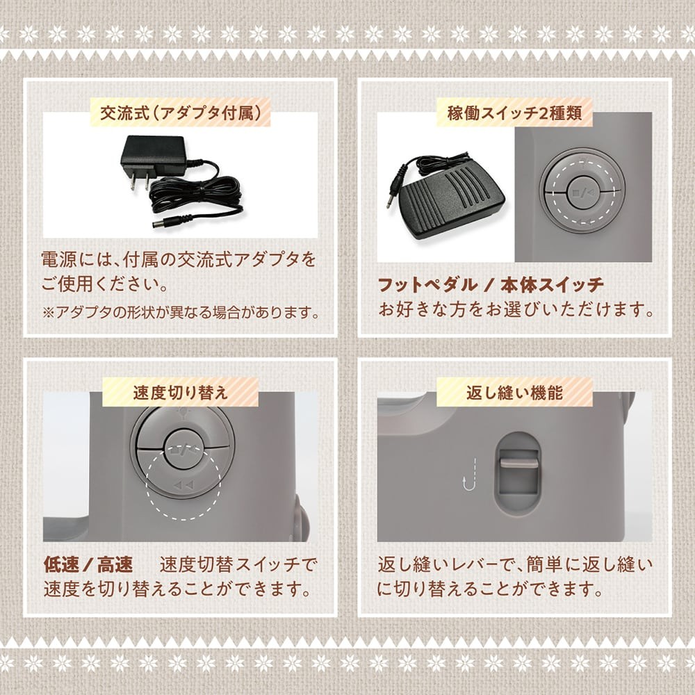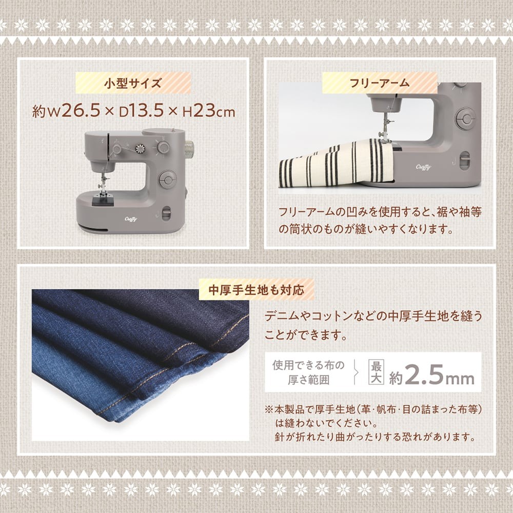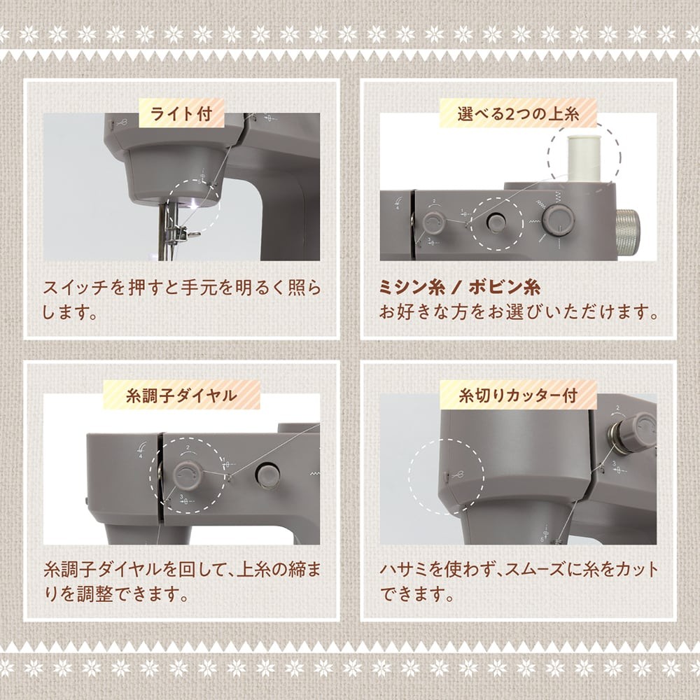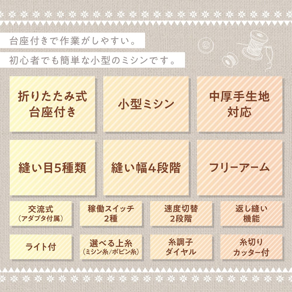台座付きで作業がしやすい、初めての方でも簡単に使える小型のミシンです。