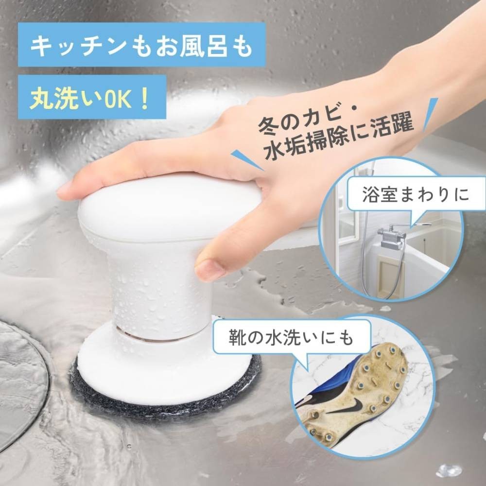 IPX7の高い防水性で水につけながら掃除が可能です。バスルームの床、上履き、車のホイール等、手元で汚れをさっときれいにしたい時に便利です。電動ブラシは汚れを落とそうと本体を押し付けると、トルクが弱くて止まってしまうものも多い中、【激落ちくん】コードレス電動ブラシは高トルクモーター搭載なので止まらずにしっかり稼働して汚れを落とします。ブラシの他に2種類のパッドも付属、用途に合わせて使い分けができます。