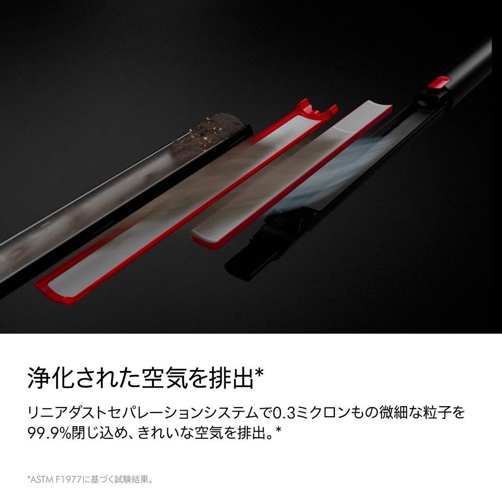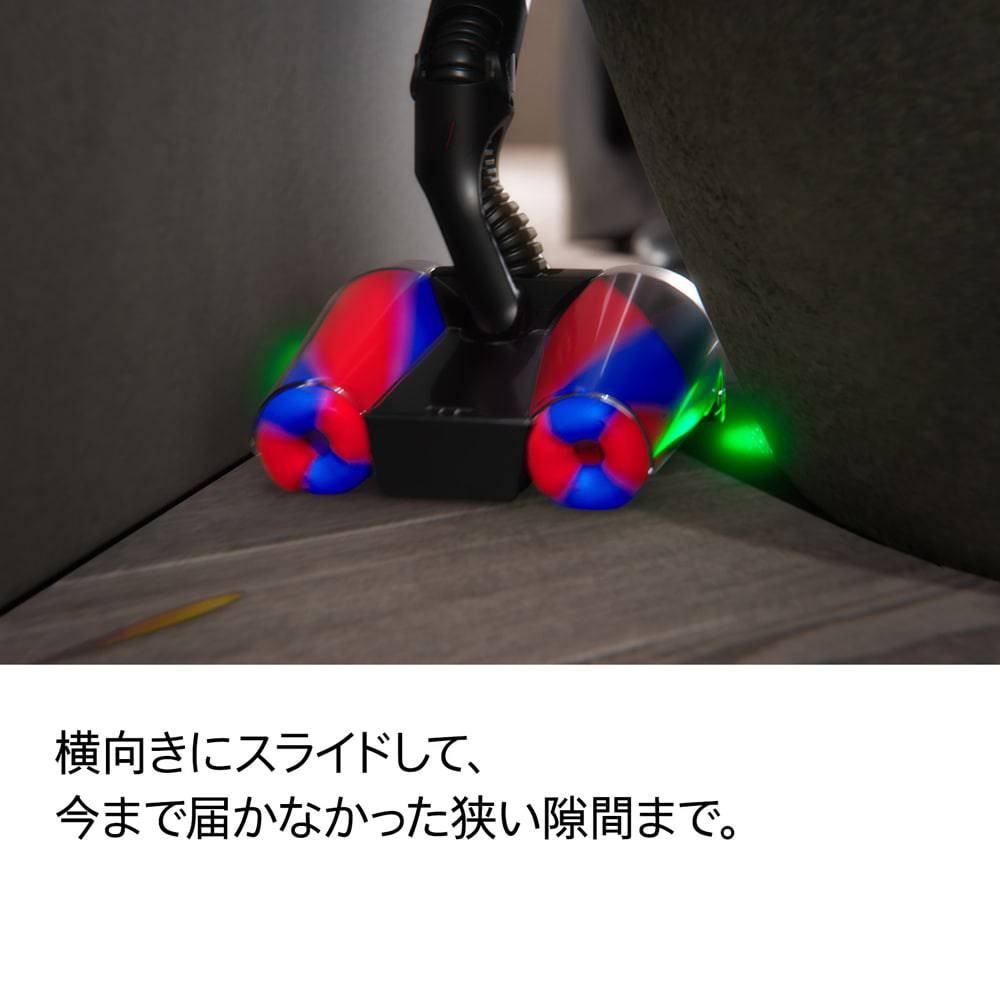 ブラシの先端部にカバーがないため、ブラシが側面に張り出し、壁に密着。ヘッドの幅全体で掃除し、際のホコリまでしっかり吸引。前後に搭載された2つのLEDが目に見えないホコリを浮かび上がらせ、掃除できていることも確認できるため、見逃しを防ぎます。