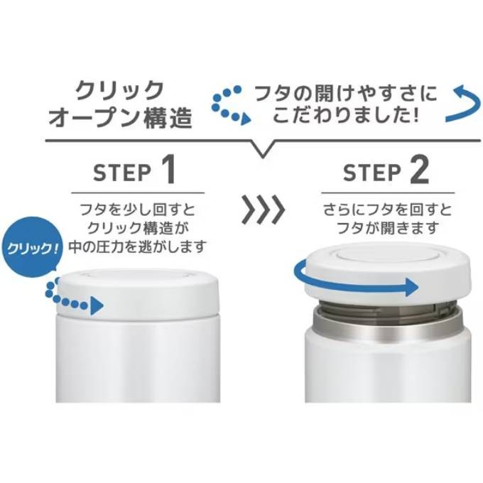 開けやすいクリックオープン構造 フタを回すとクリック構造が中の圧力を逃がす、クリックオープン構造!