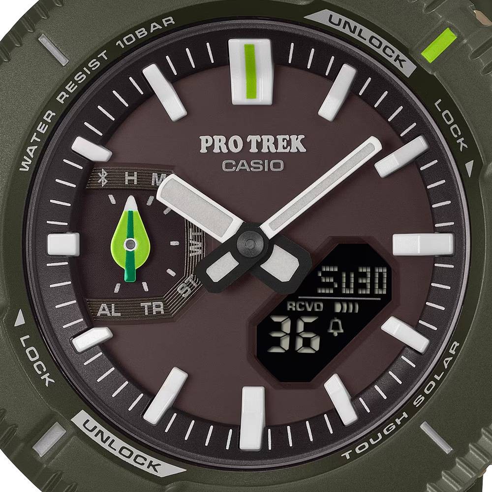 スマートフォンと連携し、時計のボタン操作で現在の時刻と位置を専用アプリの地図上に記録し行動ログとして管理できます。また、タフソーラーにより太陽光や室内光で充電し、長時間のアウトドア活動でも安心してご使用いただけます。