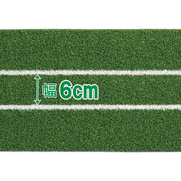 また、マットの中央部には6cm間隔の2本のガイドライン(アライメントライン)を白い人工芝を編み込んで引いてあります。パターをそのラインに合わせて「まっすぐ引いて、まっすぐ打つ」を繰り返し練習することで、パットの際に重要な方向性がイメージできるようになり、安定したパットを習得できます。