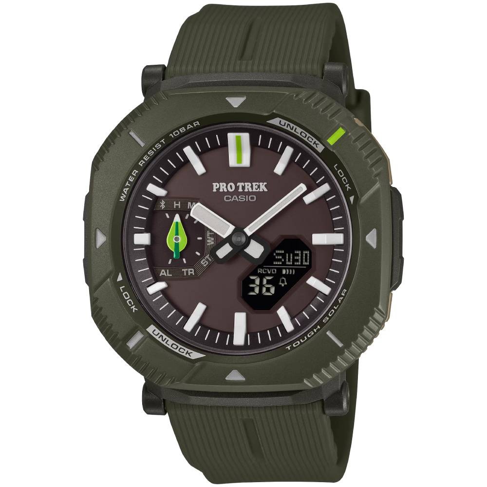 スマートフォンと連携し、時計のボタン操作で現在の時刻と位置を専用アプリの地図上に記録し行動ログとして管理できます。また、タフソーラーにより太陽光や室内光で充電し、長時間のアウトドア活動でも安心してご使用いただけます。